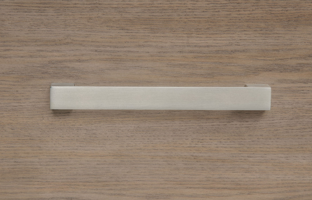 Chrome finish bar pulls add a touch of shine to the neutral barley brown finish of a modern five-drawer chest. Delivering ample storage with a comp...